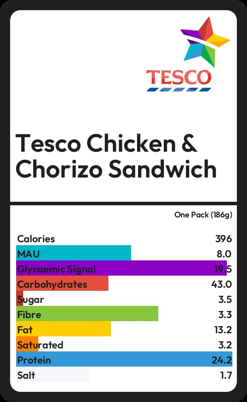 Tesco Chicken & Chorizo Sandwich contains 396.2 calories in one Pack (186g).