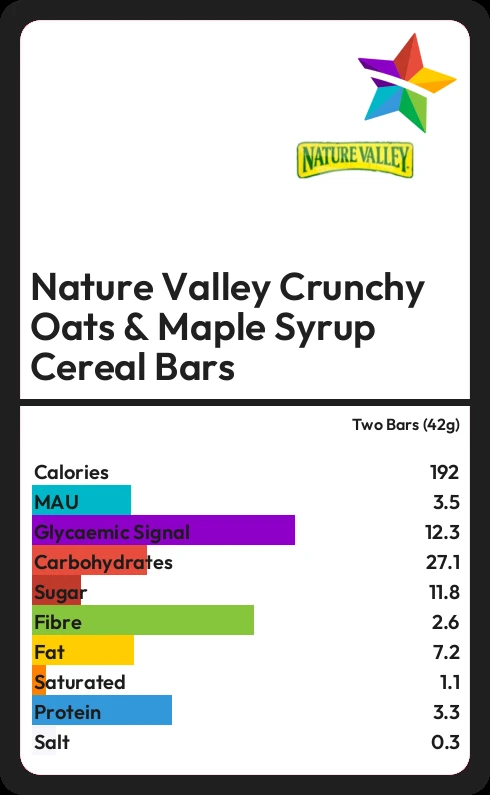 Nature Valley Crunchy Oats & Maple Syrup Cereal Bars contains 11.8g sugar in two Bars (42g) - that is around 3 cubes of sugar.
