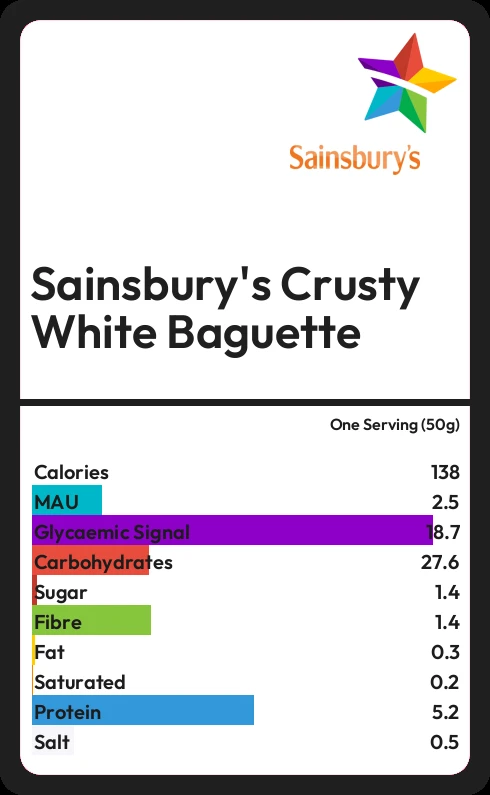 Sainsbury's Crusty White Baguette contains 1.4g sugar in one Serving (50g)