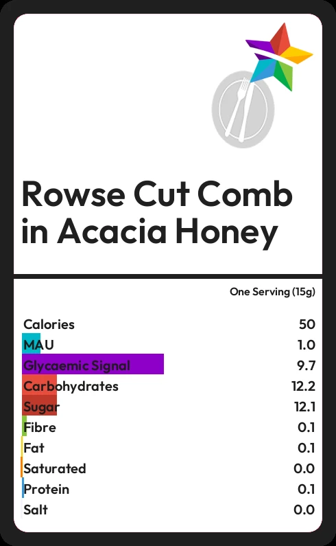 Rowse Cut Comb in Acacia Honey contains 12.1g sugar in one Serving (15g) - that is around 3 cubes of sugar.
