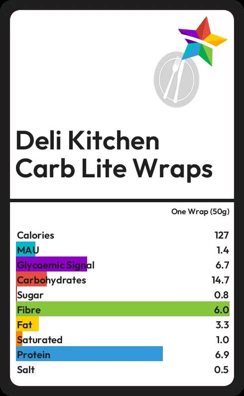 Deli Kitchen Carb Lite Wraps contains 127 calories in one Wrap (50g).