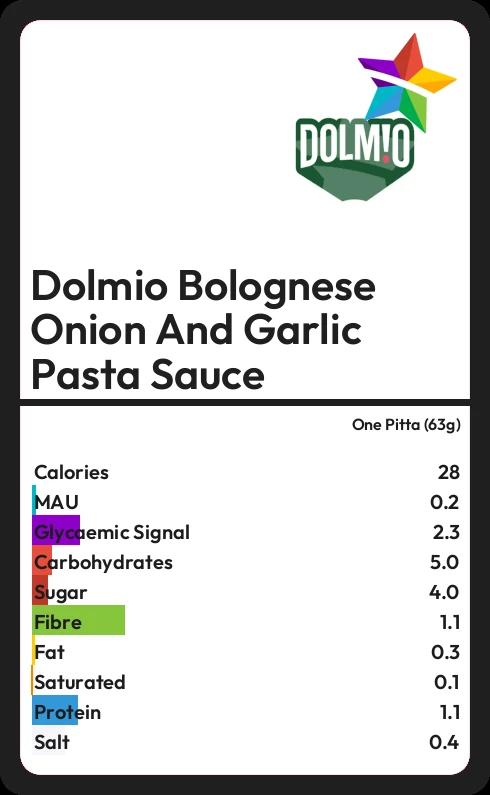 Dolmio Bolognese Onion And Garlic Pasta Sauce contains 27.7 calories in one Pitta (63g).