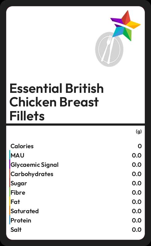 Essential British Chicken Breast Fillets contains 0.5g sugar in 100g
