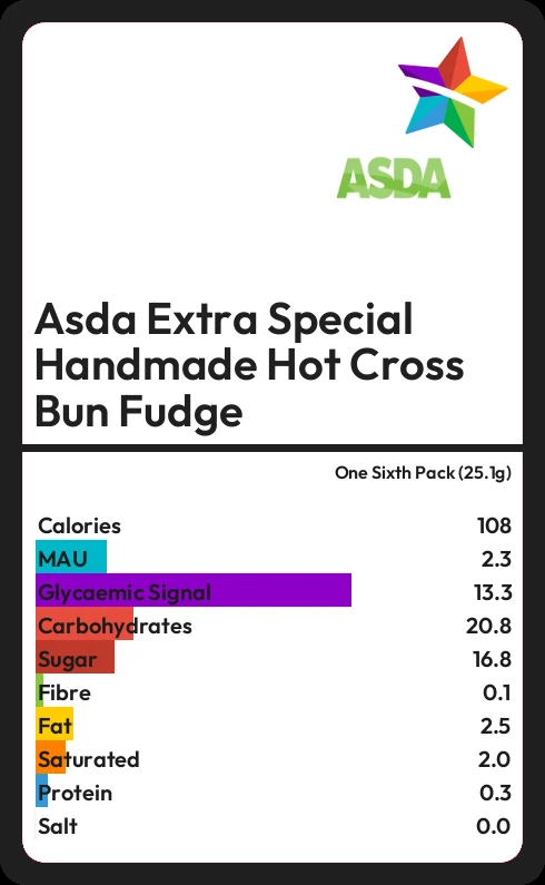 Asda Extra Special Handmade Hot Cross Bun Fudge contains 16.8g sugar in one Sixth Pack (25.1g) - that is around 4 cubes of sugar.