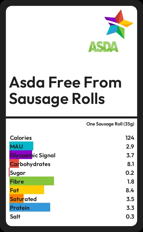Asda Free From Sausage Rolls contains 123.9 calories in one Sausage Roll (35g).