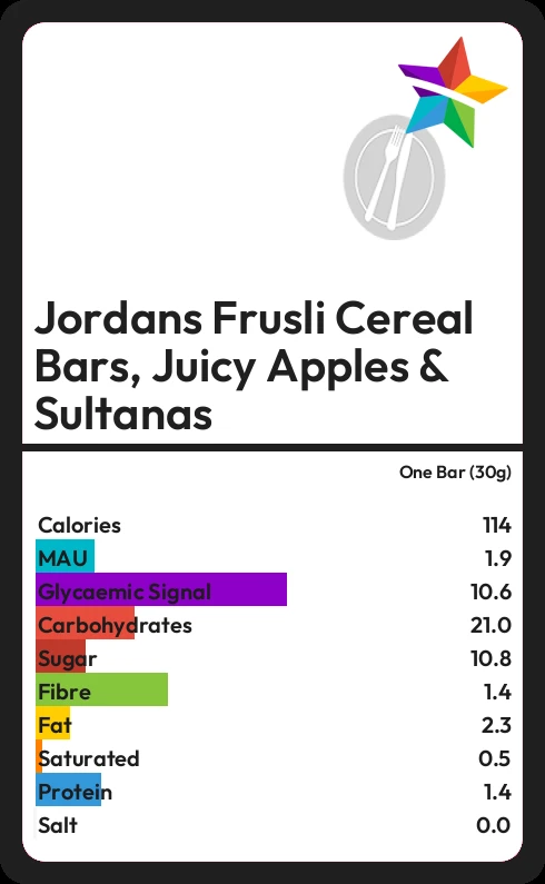 Jordans Frusli Cereal Bars, Juicy Apples & Sultanas contains 114.3 calories in one Bar (30g).