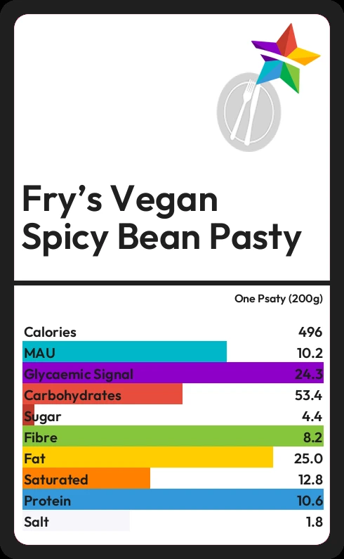 Fry’s Vegan Spicy Bean Pasty contains 496 calories in one Psaty (200g).