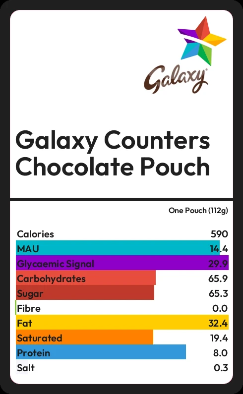 Galaxy Counters Chocolate Pouch contains 65.3g sugar in one Pouch (112g) - that is around 16 cubes of sugar.