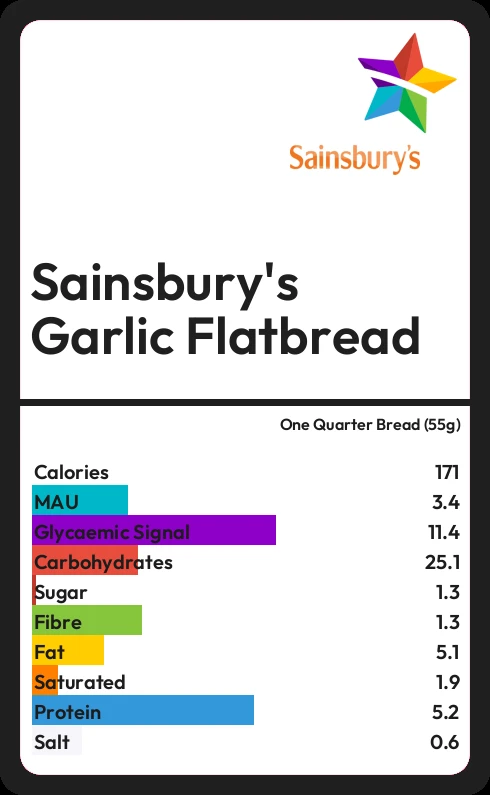 Sainsbury's Garlic Flatbread contains 1.3g sugar in one Quarter Bread (55g)