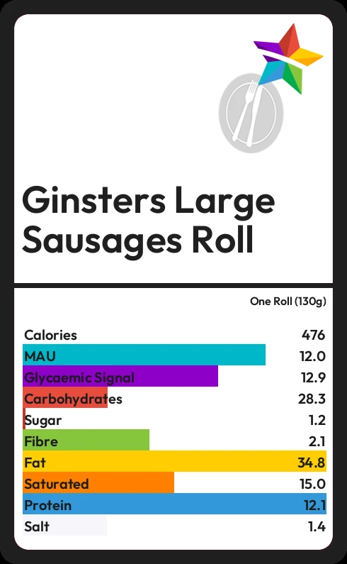 Ginsters Large Sausages Roll contains 1.2g sugar in one Roll (130g)