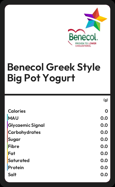 Benecol Greek Style Big Pot Yogurt contains 71 calories in 100g.