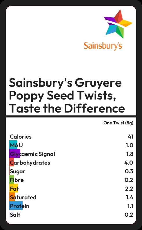 Sainsbury's Gruyere Poppy Seed Twists, Taste the Difference contains 41 calories in one Twist (8g).