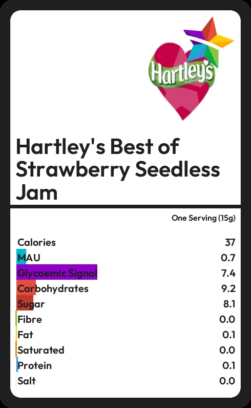 Hartley's Best of Strawberry Seedless Jam contains 8.1g sugar in one Serving (15g) - that is around 2 cubes of sugar.