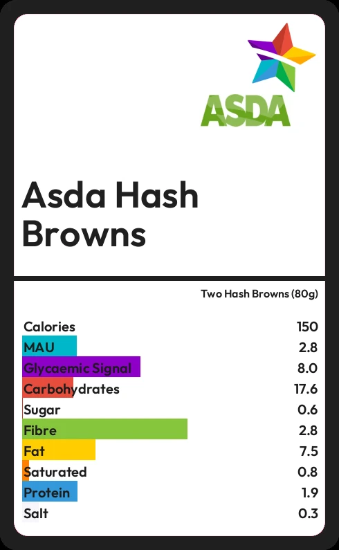 Asda Hash Browns contains 0.6g sugar in two Hash Browns (80g)