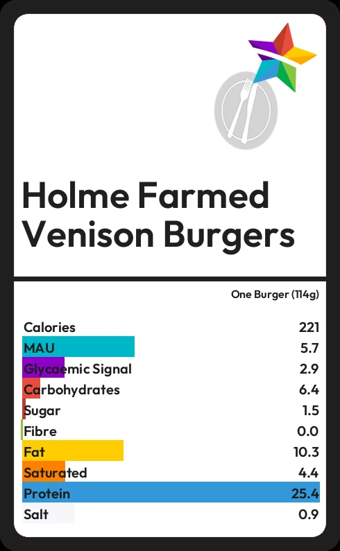 Holme Farmed Venison Burgers contains 1.5g sugar in one Burger (114g)