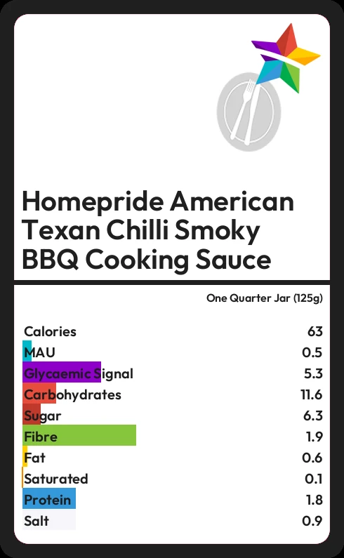 Homepride American Texan Chilli Smoky BBQ Cooking Sauce contains 63.8 calories in one Quarter Jar (125g).