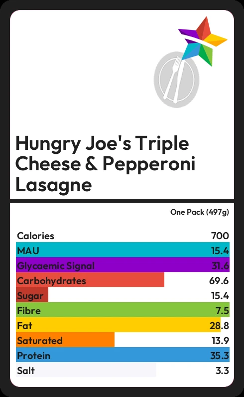 Hungry Joe's Triple Cheese & Pepperoni Lasagne contains 700.8 calories in one Pack (497g).