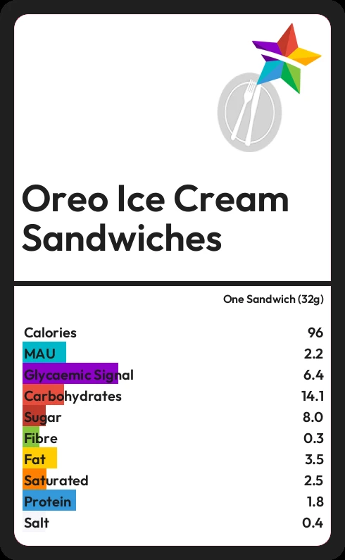 Oreo Ice Cream Sandwiches contains 8.0g sugar in one Sandwich (32g) - that is around 2 cubes of sugar.