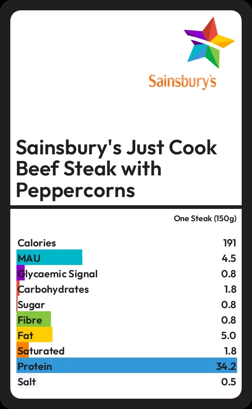 Sainsbury's Just Cook Beef Steak with Peppercorns contains 0.8g sugar in one Steak (150g)