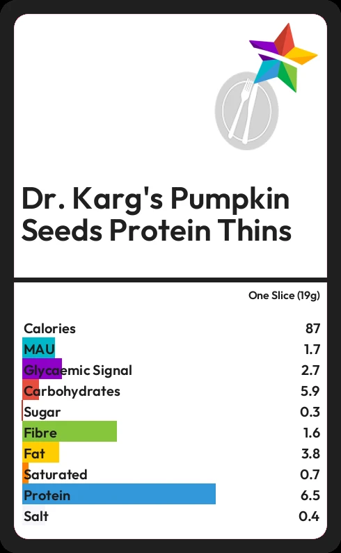 Dr. Karg's Pumpkin Seeds Protein Thins contains 0.3g sugar in one Slice (19g)