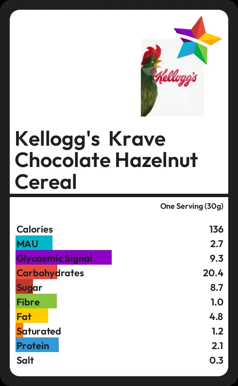 Kellogg's Krave Chocolate Hazelnut Cereal contains 8.7g sugar in one Serving (30g) - that is around 2 cubes of sugar.