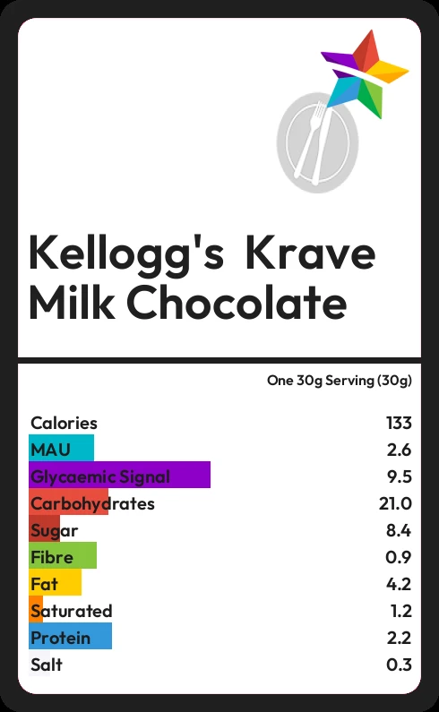 Kellogg's Krave Milk Chocolate contains 132.9 calories in one 30g Serving (30g).