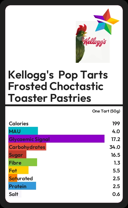 Kellogg's Pop Tarts Frosted Choctastic Toaster Pastries contains 16.5g sugar in one Tart (50g) - that is around 4 cubes of sugar.