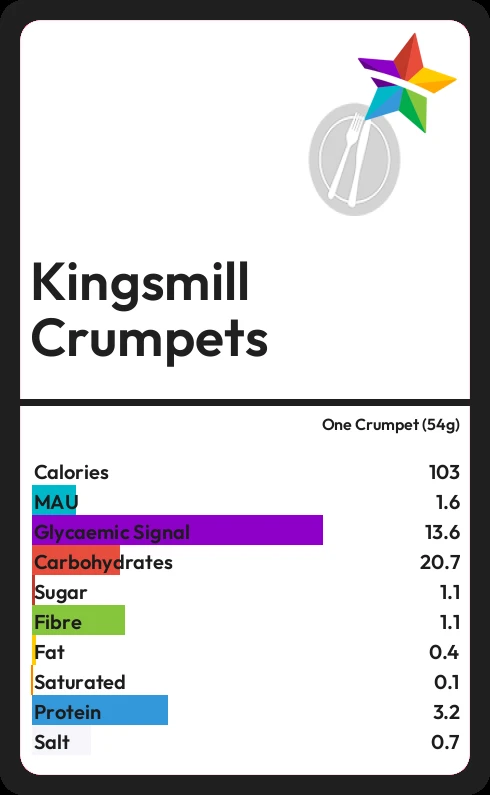 Kingsmill Crumpets contains 103.1 calories in one Crumpet (54g).