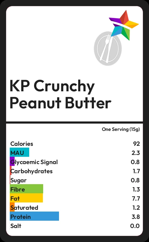 KP Crunchy Peanut Butter contains 0.8g sugar in one Serving (15g)