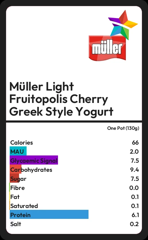 Müller Light Fruitopolis Cherry Greek Style Yogurt contains 7.5g sugar in one Pot (130g) - that is around 2 cubes of sugar.