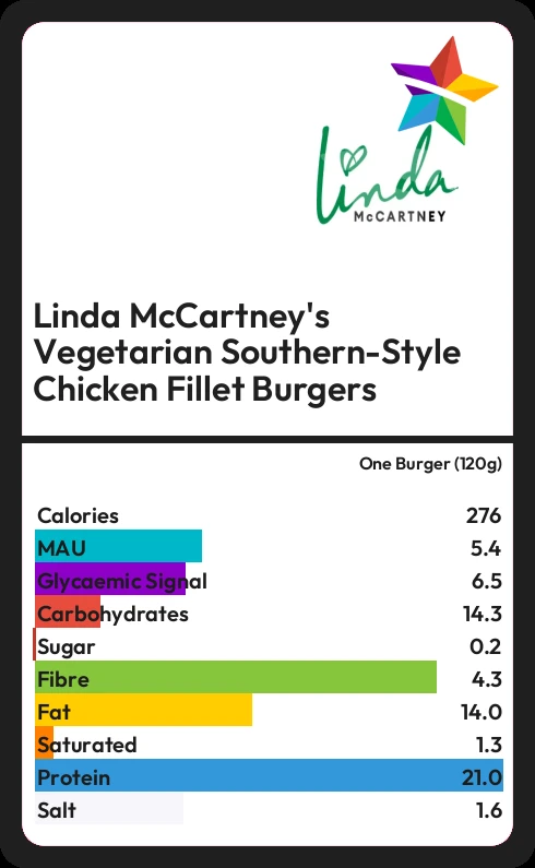 Linda McCartney's Vegetarian Southern-Style Chicken Fillet Burgers contains 276 calories in one Burger (120g).