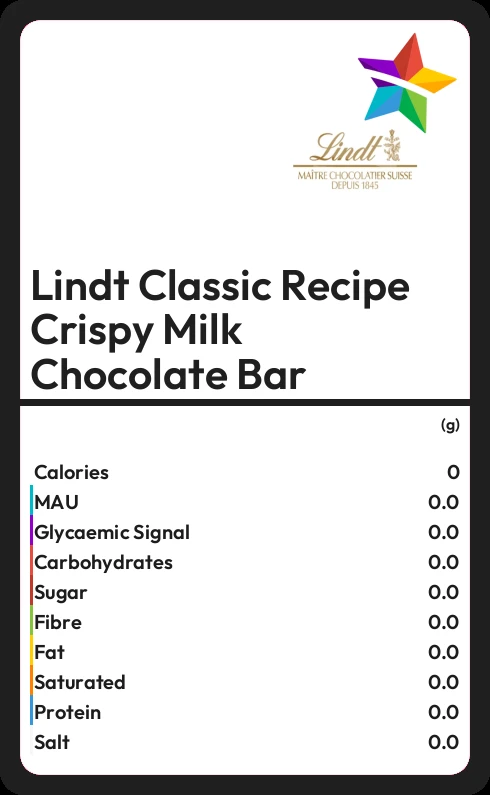 Lindt Classic Recipe Crispy Milk Chocolate Bar contains 51.0g sugar in 100g - that is around 13 cubes of sugar.
