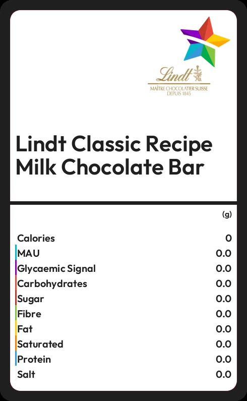 Lindt Classic Recipe Milk Chocolate Bar contains 55.0g sugar in 100g - that is around 14 cubes of sugar.