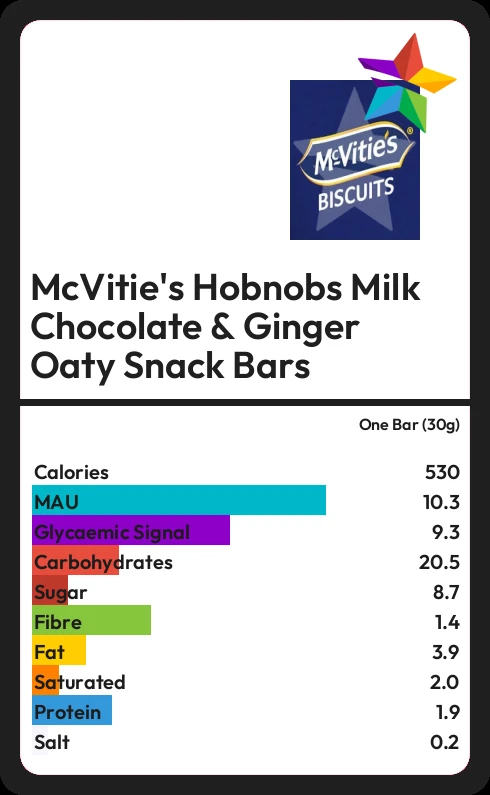McVitie's Hobnobs Milk Chocolate & Ginger Oaty Snack Bars contains 530.4 calories in one Bar (30g).