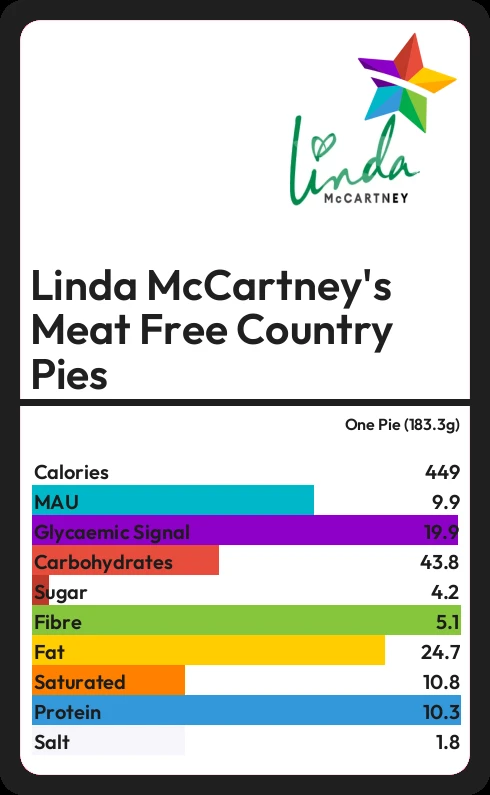 Linda McCartney's Meat Free Country Pies contains 449.1 calories in one Pie (183.3g).