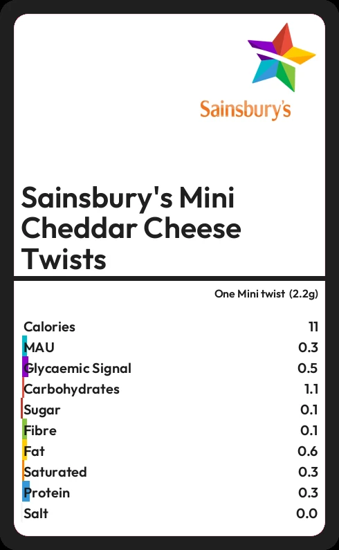 Sainsbury's Mini Cheddar Cheese Twists contains 11.3 calories in one Mini twist (2.2g).
