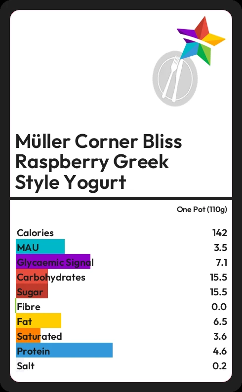 Müller Corner Bliss Raspberry Greek Style Yogurt contains 15.5g sugar in one Pot (110g) - that is around 4 cubes of sugar.