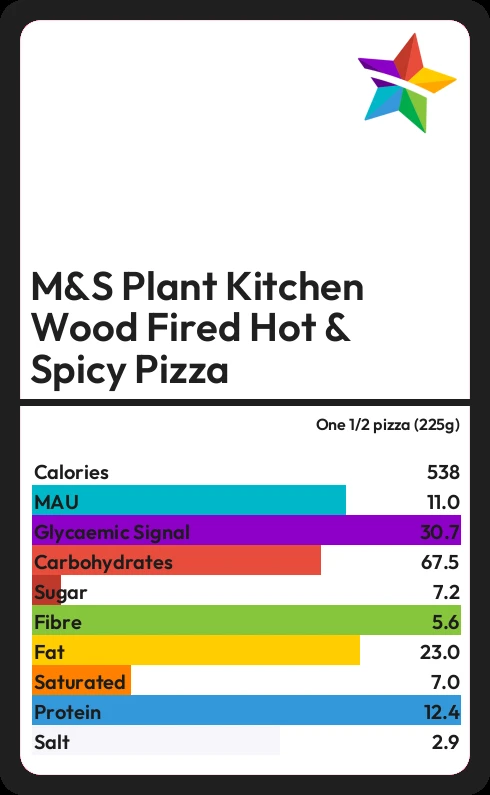 M&S Plant Kitchen Wood Fired Hot & Spicy Pizza contains 537.8 calories in one 1/2 pizza (225g).