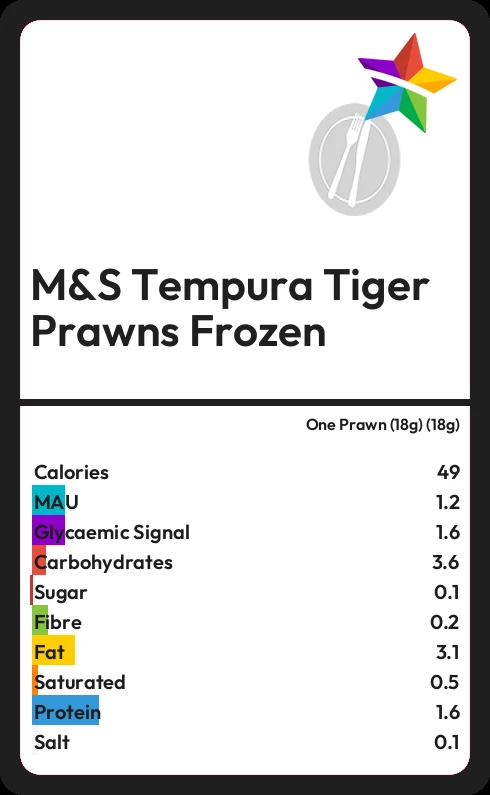 M&S Tempura Tiger Prawns Frozen contains 49.3 calories in one Prawn (18g) (18g).