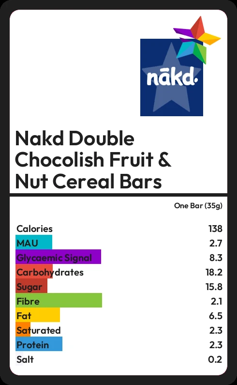 Nakd Double Chocolish Fruit & Nut Cereal Bars contains 15.8g sugar in one Bar (35g) - that is around 4 cubes of sugar.