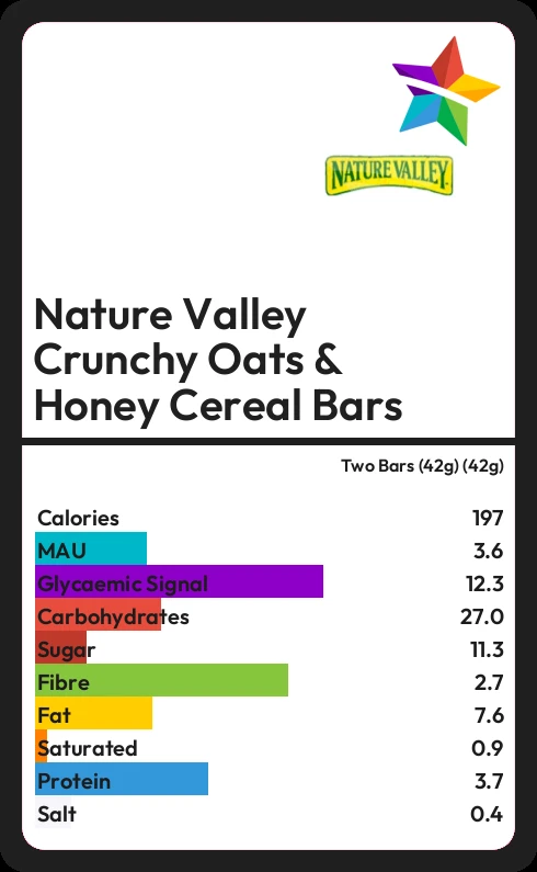 Nature Valley Crunchy Oats & Honey Cereal Bars contains 11.3g sugar in two Bars (42g) (42g) - that is around 3 cubes of sugar.
