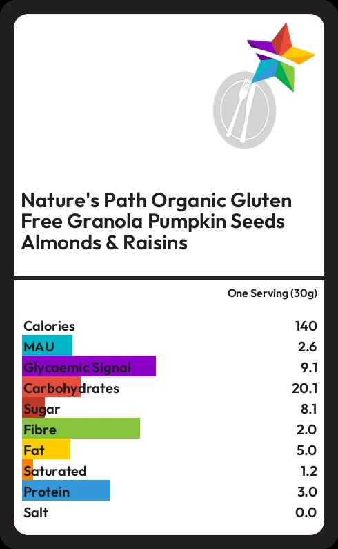 Nature's Path Organic Gluten Free Granola Pumpkin Seeds Almonds & Raisins contains 140.1 calories in one Serving (30g).