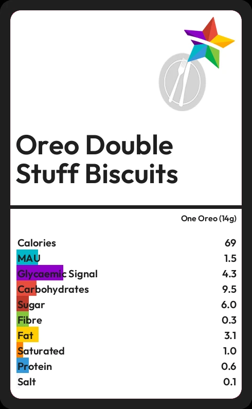 Oreo Double Stuff Biscuits contains 6.0g sugar in one Oreo (14g) - that is around 2 cubes of sugar.