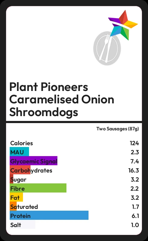 Plant Pioneers Caramelised Onion Shroomdogs contains 123.5 calories in two Sausages (87g).