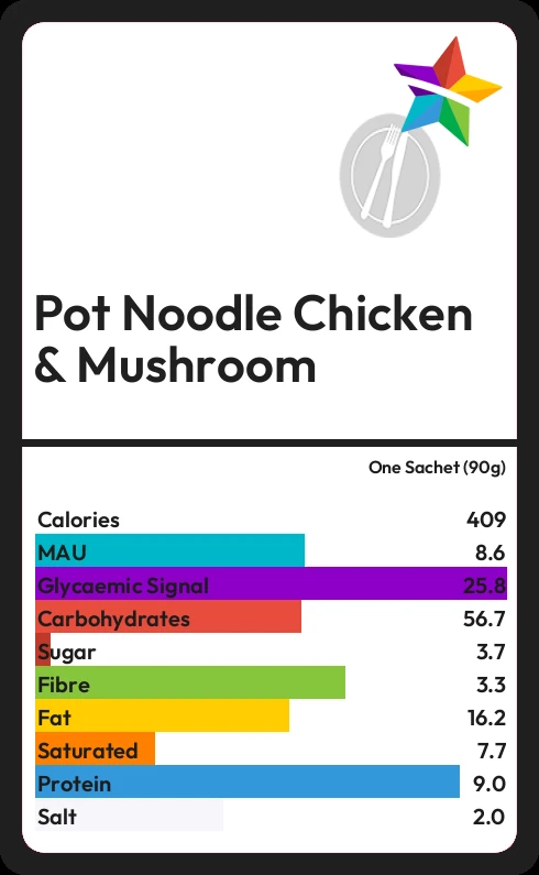 Pot Noodle Chicken & Mushroom contains 409.5 calories in one Sachet (90g).