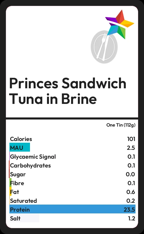 Princes Sandwich Tuna in Brine contains 100.8 calories in one Tin (112g).