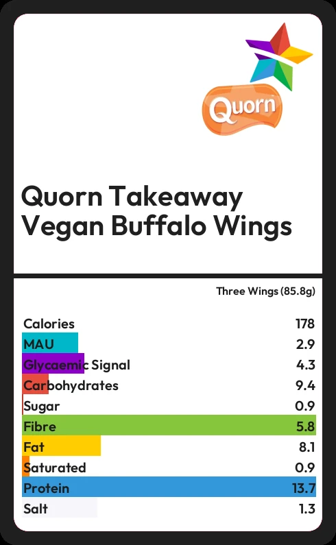 Quorn Takeaway Vegan Buffalo Wings contains 178.5 calories in three Wings (85.8g).