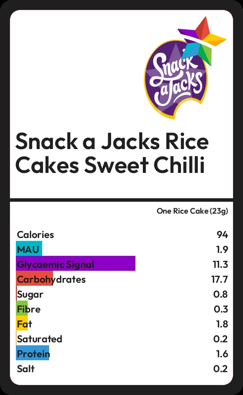 Snack a Jacks Rice Cakes Sweet Chilli contains 0.8g sugar in one Rice Cake (23g)