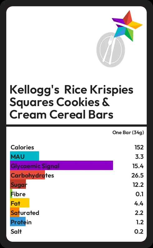 Kellogg's Rice Krispies Squares Cookies & Cream Cereal Bars contains 12.2g sugar in one Bar (34g) - that is around 3 cubes of sugar.