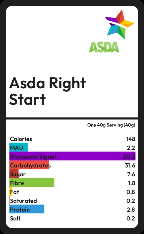 Asda Right Start contains 148 calories in one 40g Serving (40g).